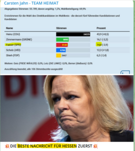 157.000 „AFD- NEUWÄHLER haben sich alleine in „HESSEN“, wo unsere „SPD- FRAU FAESER“ sich schon im AMT einer „MINISTERPRÄSIDENTIN“ sah, umorientiert.