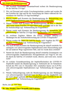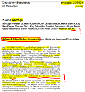 Paul-Ehrlich-Institut (PEI) gemeldet werden. Weil man die Schwächen des eigenen passiven Meldesystems kannte, hatte das PEI die App zur Überwachung von Nebenwirkungen eingeführt, um frühzeitig Sicherheitsprobleme zu erkennen. Und Probleme wurden erkannt. Nach Analyse der SafeVac-Daten treten ernste Nebenwirkungen 18-34 mal häufiger auf, als in der Datenbank des Paul-Ehrlich-Instituts angegeben ! Das PEI reagierte natürlich sofort! Es stellte die Veröffentlichung der SafeVac Daten ein. Eine kleine Anfrage der AFD (https://dserver.bundestag.de/btd/20/075/2007508.pdf) zeigt nun: die Bundesregierung kennt die Brisanz der Daten genau. 👉 Pressemitteilung Dr.Baum & Dr. Kaufmann (https://afdbundestag.de/malte-kaufmann-christina-baum-bei-der-auswertung-von-impfnebenwirkungen-verstrickt-sich-die-bundesregierung-in-widersprueche/)