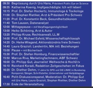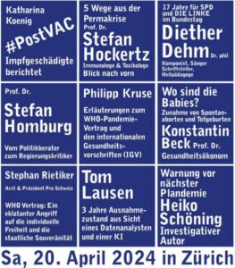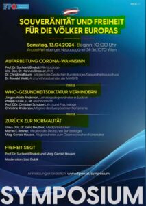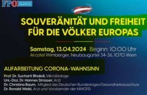 Zitat daraus: „Lockdowns, Maskenpflicht, Impfzwang und eine massive Angst- und Panikmache – wir vergessen nicht, was uns die Regierung und die Scheinopposition während der Corona-Krise angetan haben. Die Auswirkungen sind nach wie vor spürbar. Impfopfer werden ignoriert und nicht ernstgenommen. Es ist dringend notwendig, Klartext zu sprechen und die verheerenden Folgen des Corona-Wahnsinns aufzuzeigen. Und genau das tun wir bei einer spannenden Veranstaltung mit Prof. Dr. Sucharit Bhakdi unter dem Titel „Zurück zur Normalität“. Hier gibt es die Komplettübertragung – direkt aus Wien!“