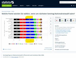 Die 28. Nationalratswahl in Österreich findet gemäß Art. 27 Bundes-Verfassungsgesetz spätestens im Herbst 2024 statt. Hier die derzeitigen (Stand April 2024) „UMFRAGEN“ zu ÖSTERREICH