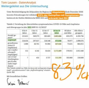 steigt mit der „mRNA- CORONA- SPRITZE“ im FALLE von „COVID 19 VIRUS“ – Ansteckung nach den obigen Zahlen vom „RKI“ um (0,92-87,53) 85,69 %