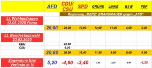 In lediglich etwa 4,5 Monaten seit den letzten BUNDESTAGSWAHLEN am 23.02.2025 zeigt sich nach „Wahlumfragen“ zwischenzeitlich folgendes Ergebnis im Hinblick auf die