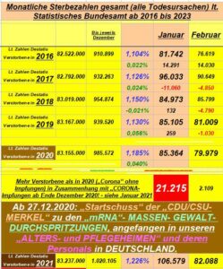 Zahlen von „DESTATIS“ unmittelbar nachdem von unserer damaligen „CDU/CSU/SPD– BUNDESKANZLERIN MERKEL am 27.12.2020 die „mRNA- DURCHSPRITZUNG“ zuerst beginnend in den „ALTERS- und PFLEGEHEIMEN“ über „Ansprache an die Bevölkerung“ quasi „per KANZLERIN- MACHTWORT“ jetzt zum „DURCHSPRITZ“ „freigegeben“ worden ist.