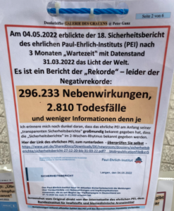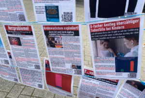 Großen Zulauf hatte die 157. Galerie des Grauens am Samstag, den 16.09.2023. Dieses Mal präsentierte sie Peter Ganz, Initiator und Betreiber in der Trompeterstadt Bad Säckingen. Gegen Ende der Veranstaltung kam es noch zu einem Dialog zwischen rund zehn jungen Männern und Peter Ganz. Die gerade mal 18-jährigen berichten über die schlimme Zeit als Schüler während dieser man ihnen „drei Jahre ihrer Jugend gestohlen hat“ und wie die Medien mit Propaganda versucht haben sie zur Impfung zu überreden, doch die Männer hielten Stand und zumindest bei ihnen haben die Medien versagt. Auch die AOK wurde hier in Verbindung mit der Propagandamaschinerie negativ erwähnt. Peter Ganz war mit der Galerie des Grauens schon am 01.06.2023 am Hochrhein, wir berichteten bereits zuvor. Damals war er in Waldshut-Tiengen in der Kaiserstraße und stellte die Galerie zum 148. Mal aus. 🚨💉 Galerie des Grauens in Waldshut zeigt Nebenwirkungen auf – Peter Ganz, Initiator im Interview • 🚨💉 Galerie des Grauens in Waldshut ze… 🚨💉 Täterprofile in der Galerie des Grauens von Peter Ganz in Waldshut-Tiengen ausgestellt