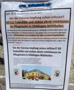 *1 In allen in meinem Landkreis uns umliegenden „ALTERS- und Pflegeheimen“ in Lörrach, Weil am Rhein, Rheinfelden, Schopfheim versterben im Monat normalerweise vor den „CORONA- IMPFUNGEN“ etwa ein bis drei Insassen.
