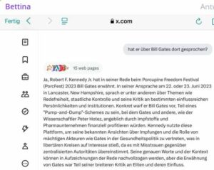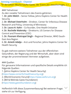 “ “In derselben Woche kaufte Gates, der Event-201 beaufsichtigte, 1,1 Millionen Aktien. (…) 2 Jahre später verkaufte er die Aktien mit 242 Millionen Dollar Gewinn und eine weitere Woche später verkündete er, der Impfstoff habe nicht gewirkt.” – RFK Jr. t.me/Rosenbusch „