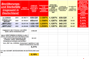 Tatsächlich verstorben sind (wohl auch einschliesslich der zwischenzeitlichen „IMPFSCHADENSTOTEN“) derzeit „DANK UNSEREN POLITIKERINNEN UND MEDIEN“ in allen 3 Jahren 2020 – 2023 bisher lediglich etwa 180.000, überwiegend im „NORMALEN BIOLOGISCHEN STERBEALTER aufgrund ihrer SCHWEREN VORERKRANKUNGEN“. DAS HEISST: DANK DER POLITISCHEN „CORONA- MASSNAHMEN“ HABEN SEIT BEGINN DER „CORONA- PLANDEMIE“ INSGESAMT 7.620.000 in 2012/2013 „GEPLANTE MENSCHEN“ IN DEUTSCHLAND UND HABEN BIS HEUTE ÜBERLEBT!