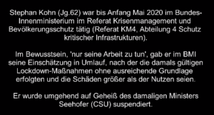 „Die Gesellschaft braucht Verschwörungstheoretiker! Stephan Kohn, damals Abteilungsleiter für Katastrophenschutz im BMI. Er hatte die Maßnahmen intern scharf kritisiert, als überflüssig und schädlich bezeichnet, und vor vielen Folgen gewarnt, die nun real sind. „