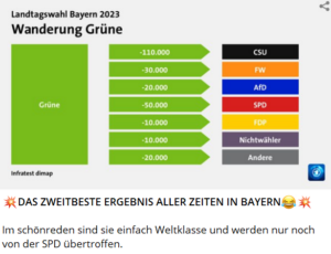 Mit heutigem am 08.10.2023 getroffenem „VOLKSENTSCHEID der Bürgerinnen Bayerns“ wird auch die „AFD“ der heute nur noch „kläglichen“ „SPD“ in Bayern von einst „Platz 2“ „nach der CSU“ trotzdem die „hintersten Zuschauerränge“ bis zur vielleicht nächsten Landtagswahl (2028 (?)) weiter frei halten, falls diese „SPD“– Partei dann überhaupt noch eine Rolle in Bayern und in Deutschland spielen sollte und sich bis dahin noch nicht selbst weiter zerlegt haben sollte in ihrer „HETZE“ gegen die „AFD“ und deren „BEVÖLKERUNGSTEILE, welche die „AFD“ wählen!!!!“