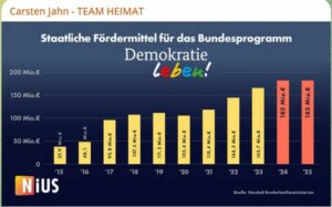 Jährlich fließen so rund 182 Millionen Euro in knapp 700 „zivilgesellschaftliche“ Projekte. Das Programm ist der Dreh- und Angelpunkt für die dauerhafte Finanzierung zahlreicher linker Lobbygruppen geworden, mit denen der Linksextremismus gestärkt wird, um gegen den angeblichen Rechtsextremismus vorzugehen.  🦅#TEAMHEIMAT🇩🇪 „