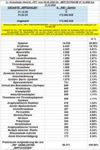 Als „CORONA- IMPFUNGEN“ (demnächst wohl „AFFEN- POCKEN- IMPFUNGEN“ oder „LEOPARDEN- POCKEN- IMPFUNGEN) deklarierte „GIFT- SPRITZ- Stoffe“ und bekannte „FOLGESCHÄDEN“ nach „IMPFUNGEN (?) / GIFT- DURCHSPRITZUNGEN“ durch unsere „ÄRZTE“ UND „HAUSÄRZTE“ UND „IMPFZENTREN“….. – = aus dem Bericht (aus 100.000) errechnete etwaige tatsächlich lediglich nur dem „PEI“ GEMELDETER ZAHLEN! – noch ohne „DUNKELZIFFER“ DER DEM „PEI“ NICHT GEMELDETEN ZAHLEN!