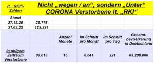 Demgegenüber im selben Zeitraum 27.12.2020 bis 31.03.2022 Zahlen des „RKI“ von den „Unter, nicht an“ Corona, fast ausschliesslich aus Altersgründen Verstorbenen