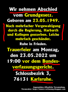 https://t.me/kenjebsen/7902         Zitat daraus:    „RIP Grundgesetz✝️   Vor genau 73 Jahren – am 23. Mai 1949 – wurde das Grundgesetz feierlich verkündet. Im BRD-Regime, wo Polizeigewalt mittlerweile an der Tagesordnung ist, wurde es 2020 auf brutale Art und Weise abgeschafft.☠️  Wer bei diesem Video keine Gänsehaut bekommt, der hat sich bereits mit der Diktatur abgefunden! „      https://t.me/kenjebsen/7937