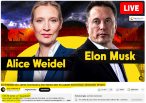 das heute Abend stattfindende Gespräch zwischen dem X-Chef und Trump-Flüsterer Elon Musk und der AfD-Kanzlerkandidatin Alice Weidel. Und wir natürlich auch. Ab 19 Uhr werden wir den Livesteam von „Kontrafunk“ mit einer Simultan-Übersetzung auf unserem X-Account starten. Unmittelbar nach Ende der Unterhaltung wird die JUNGE FREIHEIT das Gespräch analysieren. Mit an Bord sind JF-Chefredakteur Dieter Stein, der bekannte Youtube-Politik-Influencer Kolja Barghoorn (Aktien mit Kopf), JF-Social-Media-Leiter Vadim Derksen und der Leiter der Online-Redaktion, Henning Hoffgaard.