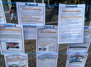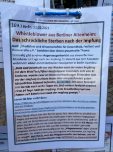 https://t.me/miteinander_mutig_sein/19802   Zitat daraus:   „Immer mehr Zustimmung in der breiten Bevölkerung für die Ausstellungen der Impf-Opfer, die von immer mehr Initiativen angefordert oder selbst realisiert wird. Heute war eine der Ausstellungen am Phönixsee in Dortmund. Rund 20.000 flanierende Passanten und Anwohner konnten sich über den Tag von 10-20 Uhr verteilt interessante Berichte durchlesen und den Ton-Aufnahmen lauschen, die uns Menschen mit Impfschäden zugesandt haben, um andere Menschen vor der Giftspritze zu warnen. Weiter so, ihr lieben Menschen, die diese Ausstellungen unterstützen. LG Micha Schele“