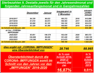 UND DAS ALLES AUCH TROTZ FRÜHZEITIGSTER „WARNUNGEN VOR DER SPRITZE“ DURCH „AUSGEGRENZTE“ ANERKANNTE WISSENSCHAFTLER „WELTWEIT“ UND DEN ZAHLEN VON „DESTATIS (laufend aktualisierte Gesamtsterbe- DATEN mit Altersaufgliederungen über Jahre seit 2016 hinweg in Deutschland)“ UND DES „RKI“ ebenfalls laufend aktualisierte DATEN über tägliche angebliche „CORONA- STERBEFÄLLE“ vor und mittels später (ab Dez. 2020) der „IMPFUNGEN“…..
