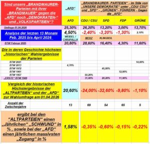 **************************************** (vorstehend aus WIKIPEDIA) Wo stehen nach derzeitigen „VOLKS- WAHL- UMFRAGEN“ diese damaligen einst „VOLKSPARTEIEN“ heute – die heutigen „BRANDMAURER- PARTEIEN“ gegen die Partei der „AFD“? – Nach „CDU/CSU-SPD MERKEL„ und „SPD-GRÜNEN SCHOLZ„ jetzt unter dem „CDU/CSU-SPD MERZ„? (Anm.: eine Frage für künftige „HISTORIKER“ zur Geschichte Deutschland´s nach