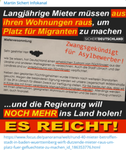 „Langjährige Mieter müssen aus ihrer Wohnung raus, um Platz für Migranten zu machen. Dreiste Verdrängung mit System!“