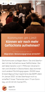 Zitat daraus: “ 18.02.2023 #sternTV #Talk Überlastete Unterkünfte für Geflüchtete, fehlender Wohnraum, Städte und Kommunen am Limit: Aufgrund von ausgeschöpften Kapazitäten werden Notunterkünfte für Geflüchtete zur Dauerlösung. Bei immer mehr nachkommenden Asylsuchenden ein scheinbar unlösbares Problem. Matthias Schimpf, hauptamtlicher Kreisbeigeordneter Kreis Bergstraße, Bündnis 90 / Die Grünen, hat die Lage eingeschätzt.„