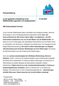Zitat daraus: „Miguel Klauß und Hans-Jürgen-Goßner beides Mitglieder des Landtags Baden-Württemberg vertreten die AfD-Fraktion im Ausschuss für Landesentwicklung und Wohnen. Hans-Jürgen-Goßner teilt in einem Schreiben vom 31.03.2023 die Beantwortung des Ministeriums für Landesentwicklung und Wohnen auf den Antrag seines Kollegen Miguel Klauß und ihm zur beabsichtigten Mieterverdrängung durch Flüchtlinge in Lörrach.“