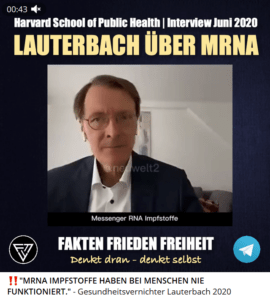 …..gibt noch in 2020 zu: https://t.me/FaktenFriedenFreiheit/22909 Zitat daraus: „‼️“MRNA IMPFSTOFFE HABEN BEI MENSCHEN NIE FUNKTIONIERT.“ – Gesundheitsvernichter Lauterbach 2020 Heute wissen, wir dass sie wirken. Die Zahl der Impftoten steigt täglich… Juni 2020, in einem Interview der Harvard School of Public Health, sagte unser Gesundheitsvernichter Lauterbach ganz lappidar, dass er gespannt sei, wie man MRNA-‚Impfungen‘, die noch nie bei Menschen funktioniert haben, eben diesen flächendeckend verabreicht. Psychopath… #plötzlich und unerwartet“