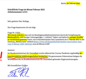 „BMG verfügt über keinerlei Belege für Lauterbachs Aussagen zur Wirksamkeit der Maskenpflicht💥Nach 3 Jahren Plandemie kann das BMG auf Anfrage keine einzige Studie vorlegen, die die Wirksamkeit der Maskenpflicht belegt. Karl Lauterbach äußert aber immer wieder öffentlich genau das, auch immer wieder in Talkshows. Vielmehr meint das BMG, dass eine Aussage nach dem Motto „Es ist einfach so“ ausreichen würde, um solche Behauptungen zu untermauern.