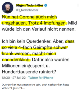 Trotz 4 „Impfungen“ erkrankt, spricht von „NOCH milden Symptomen und Vermeidung von Komplikationen“, hat scheinbar selbst die Hosen so voll, dass er sich sogar Paxlovid reinpfeift und in spätestens 2 Wochen wird er dann von seinem Rebound erzählen. TOP👍 Die beste Werbung für diesen „Impfstoff“ und die 4. „Impfung“, die man sich vorstellen kann 🤣🤣🤣“ https://t.me/FYIDA_2022/1525 Zitat daraus: „Lauterbach: Sprecher verweigert Auskunft über vierte Impfung Die Journalistin Janina Lionello des Nachrichtenformats „Achtung, Reichelt!“ wollte wissen, wie lange die letzte Impfung zurückliegt. Das Bundesgesundheitsministerium verweigert diese Auskunft nach Lionellos Angaben. Sie zitiert einen Sprecher des Ministeriums: „Bitte haben Sie Verständnis dafür, dass wir nicht in Details zu medizinischen Angelegenheiten gehen können.“ Die Weigerung, den Zeitpunkt der letzten Impfung von Karl Lauterbach bekannt zu geben, sorgt für Unverständnis. So schreibt etwa der Journalist Tim Röhn (Welt): „Seit 1,5 Jahren werden die Bürger dazu verdonnert, ‚medizinische Angelegenheiten‘ ggü. irgendwelchen Türstehern, Kellnern und Zugkontrolleuren offenzulegen. Der Gesundheitsminister selbst hingegen mag solche Infos nicht herausgeben.“ Es sei daher „höchste Zeit, Covid-Zertifikate einzustampfen“.“ https://www.berliner-zeitung.de/news/mit-corona-infizierter-karl-lauterbach-raetsel-um-vierte-impfung-zeitpunkt-infektionsschutzgesetz-li.253883