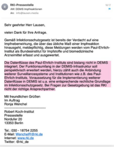https://t.me/TomLausen/77 Zitat daraus: „UNSERE WICHTIGSTEN BEHÖRDEN MACHEN EINFACH IHRE ARBEIT NICHT Nachdem ich sah, dass schon 2019 (!) für den Pandemiefall geplant war, Impfreaktionen und Nebenwirkungen direkt über das elektronische Meldesystem DEMIS zu übertragen, fragte ich beim RKI nach, ob dies geschah! Antwort: Nö, seit 2019 ist hier nichts passiert. Impfnebenwirkungen sind den Behörden offenkundig nicht wichtig. Wissen wir ja schon.. Und das Beste: Wegen jeder Maßnahme wird das Infektionsschutzgesetz manipuliert, aber das hier wird von der Politik ignoriert. Wer sich impfen lässt darf hier nicht auf Hilfe hoffen. Augen auf bei den vermeintlichen Gesundheitsschützern der Regierung! „