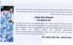 Eine öffentliche „Danksagung“ aus der „OBERBADISCHEN“ von den Enkeln ihrer im „LANDKREIS LÖRRACH“ nach der ersten in einem LANDKREIS-LÖRRACH-lichen „ALTEN- und PFLEGEHEIM“ mittels „mRNA- GIFTSPRITZUNG“ um- ZU TODE- gebrachten „Lieblings- OMI“! – vorher der mRNA- GIFT- TODES- SPRITZE noch altersgemäss vollkommen „fit“ lt. einer/ eines Enkelin´s!!!!!