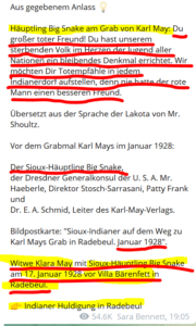 https://t.me/neuesvonwilli/49 Zitat daraus: „Eben gehört: Die ARD zeigt aus ideologischem Rassenwahn keine Karl – May – Filme mehr. Ganz anderer Ansicht waren 1928 die Indianer selbst, als sogar einer ihrer Häuptlinge das Grab von Karl May besucht. Das Bild zeigt neben dem Sioux – Häuptling Big Snake den Dresdner Generalkonsul der USA Haeberle, daneben Zirkustdirektor Stosch – Sarrasani und Vertreter des „Karl-May-Verlags“.“
