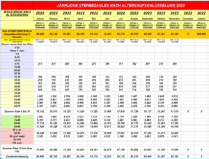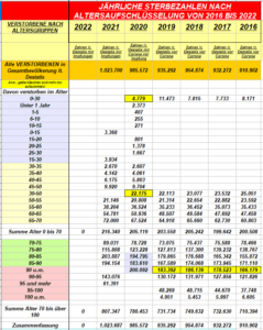 In den Vorjahren seit 2016 bis 2019 vor CORONA / dann 2020 unter Corona / dann ab 2021 unter den „mRNA- GEN- GIFTSPRITZUNGEN“ sehen die „DESTATIS“- STERBEZAHLEN IN DEUTSCHLAND wie folgt aus (2022 siehe vorstehend):