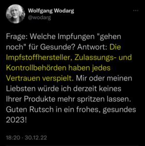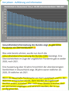 Zitat daraus: „Medien im Wandel – Ruderboot #11 27.11.2022 Ob Publizisten, Moderatoren, Kommunikationswissenschaftler oder Schauspieler – viele Medienschaffende werden aus dem Mainstream verdrängt, wenn man eine gewisse Agenda nicht mittragen möchte oder sogar dagegen argumentiert. In dieser Sendung begrüßen die Moderatoren Katrin Huß und Alexander Kühn die ehemalige RTdeutsch-Moderatorin Jasmin Kosubek. Sie erzählt über ihre neue Selbstständigkeit als YouTuberin und Bürgerjournalistin. Ebenfalls der seit der Einführung der 2G-Regel am Filmset arbeitslose Toni Engel, berichtet über sein Jahr 2022 – ohne Engagements aus der Filmindustrie. Prof. Michael Meyen ist eigentlich Journalist. Nachdem er als Prof. für Kommunikationswissenschaft nun keine Fördergelder mehr bekommt, aufgrund seiner öffentlich geäußerten Meinung, zieht es ihn zu seinen journalistischen Wurzeln zurück. Der Publizist und Medienkritiker Walter van Rossum macht die Gesprächsrunde komplett und gibt einen tiefen Einblick in das verkommende Demokratieverständnis in den deutschen Leitmedien.“ Besonders im Januar und Februar 2021 begann dann die mittels unserer „POLITIK“ in DEUTSCHLAND ab Ende Dezember 2020 verordneten „mRNA- TODESSPRITZE“ unter unserer Bevölkerung „explosionsartig zu wirken, was wir vor allem an den STERBEZAHLEN von „DESTATIS“ ganz besonders auch heute nachvollziehen können! – Nicht „CORONA“ war wohl das „politische“ Ziel, sondern die „REDUZIERUNG DER BEVÖLKERUNG in Deutschland“ DURCH DIE FLÄCHENDECKENDEN „mRNA- GIFTSPRITZUNGEN“ u.a. auch durch „DEUTSCHLANDWEITE“ INSTALLIERTE „IMPFTEAMS und HAUSÄRZTEN“ UND UNTER VERSTÄRKUNG MIT TEAMS aus der „BUNDESWEHR“?